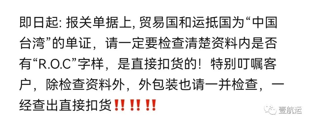 一則關於“報關單據上, 貿易國和運抵國為“中國台灣”的單證,資料內有“ROC”字樣,將直接扣貨!”的傳聞,在國際貨代物流業被刷屏了!
