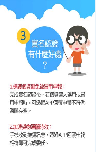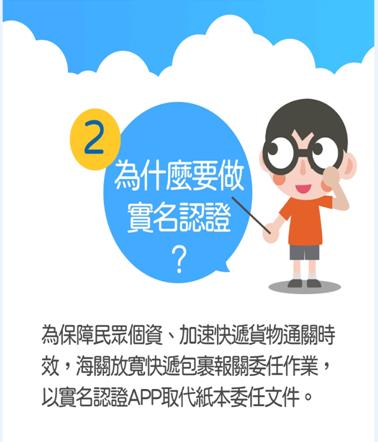 貨物(含一般國際寄送及跨境網購)只要進口臺灣均須向海關申報,而進口人委由報關業者向海關申報進口貨物時,應提供報關業者相關委任文件,惟紙本報關委任文件對民眾個資保護不足,亦影響快遞貨物通關時效,故為提供民眾更加便捷與安全之通關服務,海關於107年鬆綁法規(詳參空運快遞貨物通關辦法第17條第3項),放寬進口快遞簡易申報之紙本報關委任得以實名認證APP方式線上辦理。民眾可透過APP「EZ WAY易利委」完成以手機門號綁定個人身分證號或居留證號之實名認證程序,完成App實名認證以簡化紙本委任書之給予,嗣後簡易快遞貨物進口時即不需要再提供身分證號碼給物流業者,以保障個人資料安全。