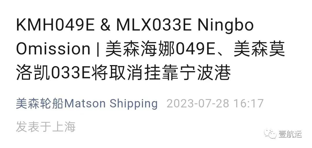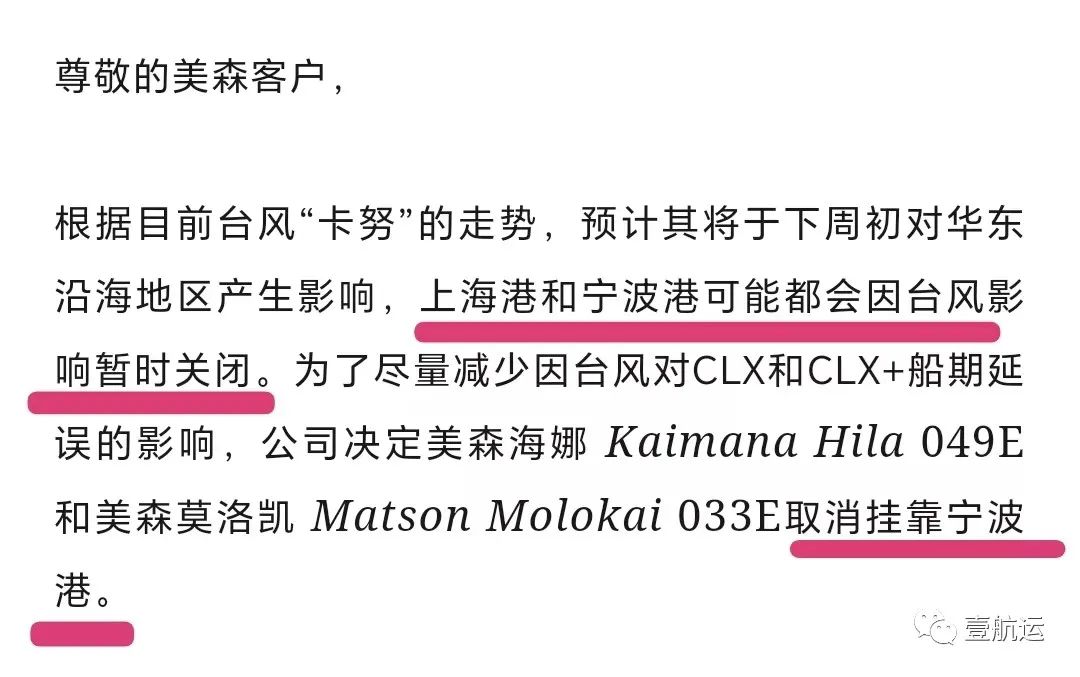 為了盡量減少因颱風對CLX和CLX+船期延誤的影響,美森輪船決定美森海娜Kaimana Hila 049E和美森莫洛凱Matson Molokai 033E取消挂靠寧波港