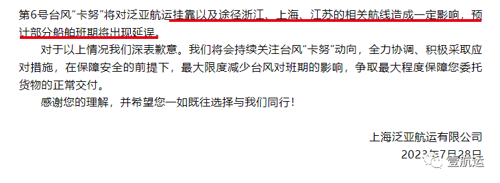 上海汎亞航運發出了《關於2023年第6號颱風“卡努”影響班期告知書》